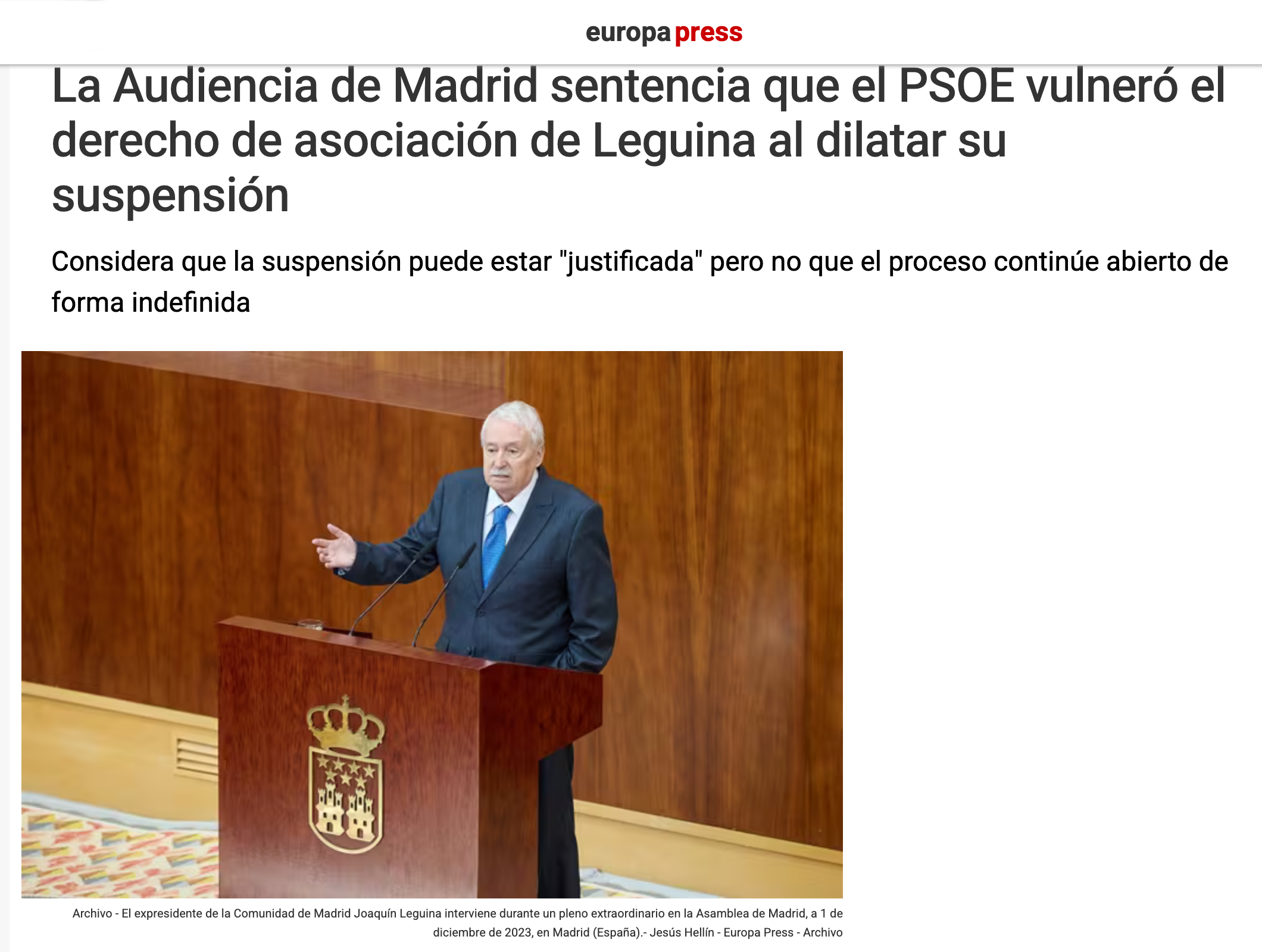 Título: La Audiencia de Madrid sentencia que el PSOE vulneró el derecho de asociación de Leguina al dilatar su suspensión